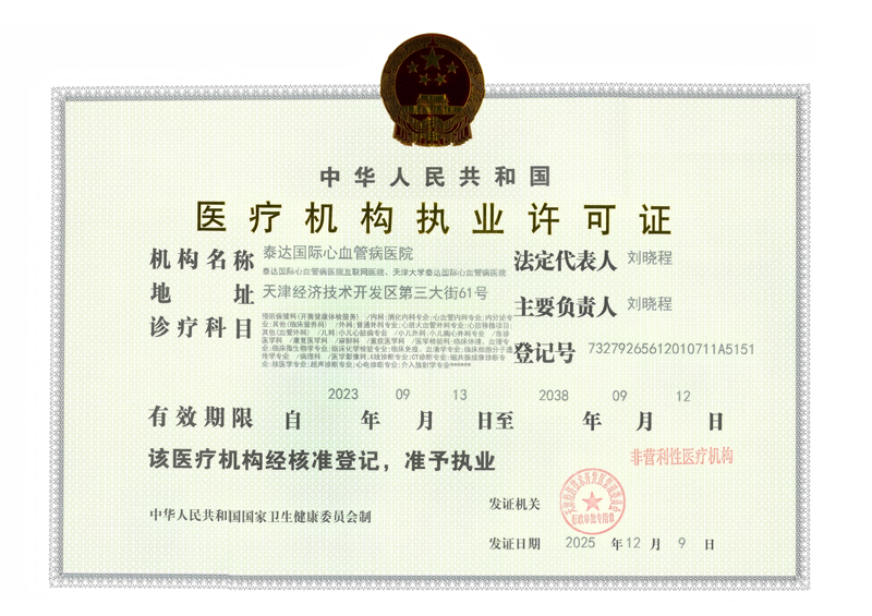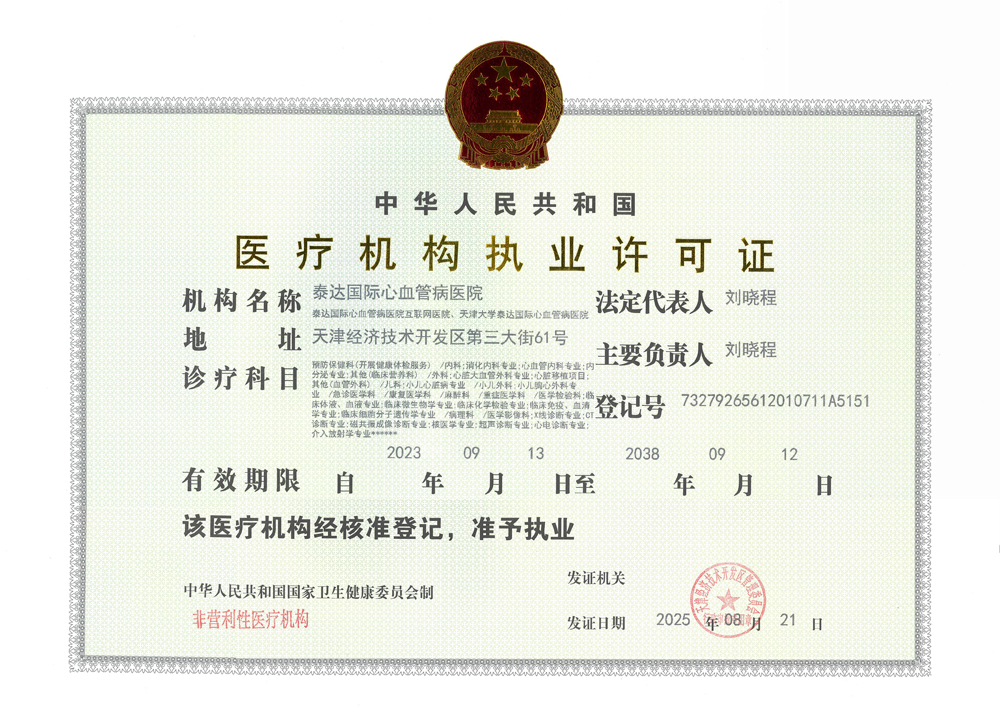 泰达国际心血管病医院依法执业承诺书及医疗机构执业许可证