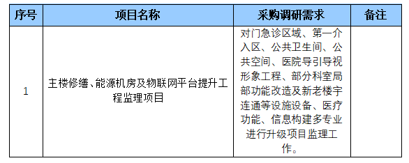 为便于供应商及时了解主楼修缮、能源机房及物联网平台提升工程监理项目调研信息,现将泰达国际心血管病医院调研信息公开如下: