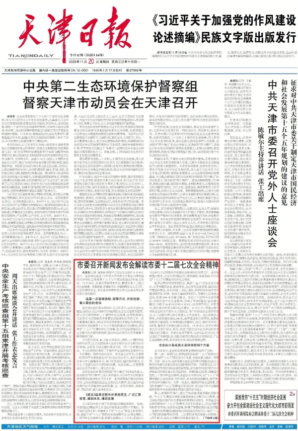 市委十二届七次全会于11月18日召开。全会审议通过了《中共天津市委关于制定天津市国民经济和社会发展第十五个五年规划的建议》和全会决议。11月19日,市委召开新闻发布会,解读市委十二届七次全会精神。市委常委、市委秘书长,市委新闻发言人王力军,以及市委研究室、市发展改革委相关负责人出席发布会并回答记者的提问。