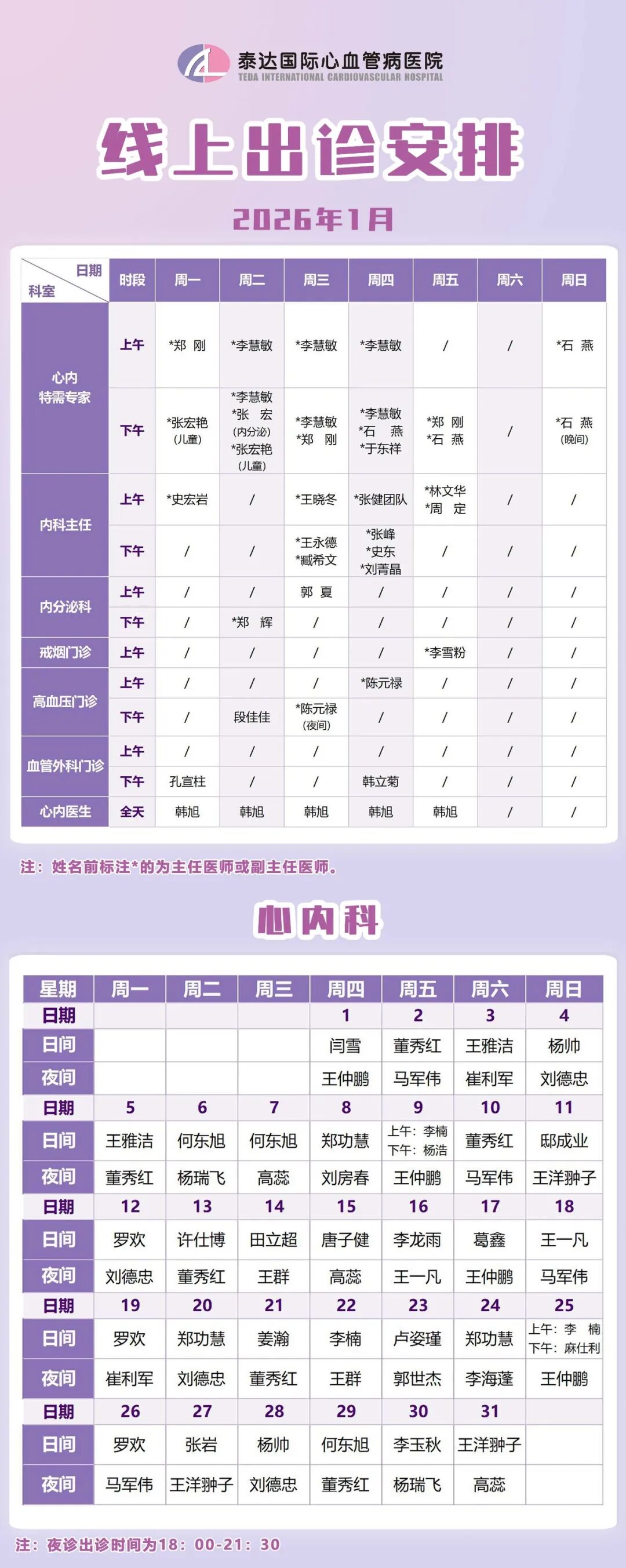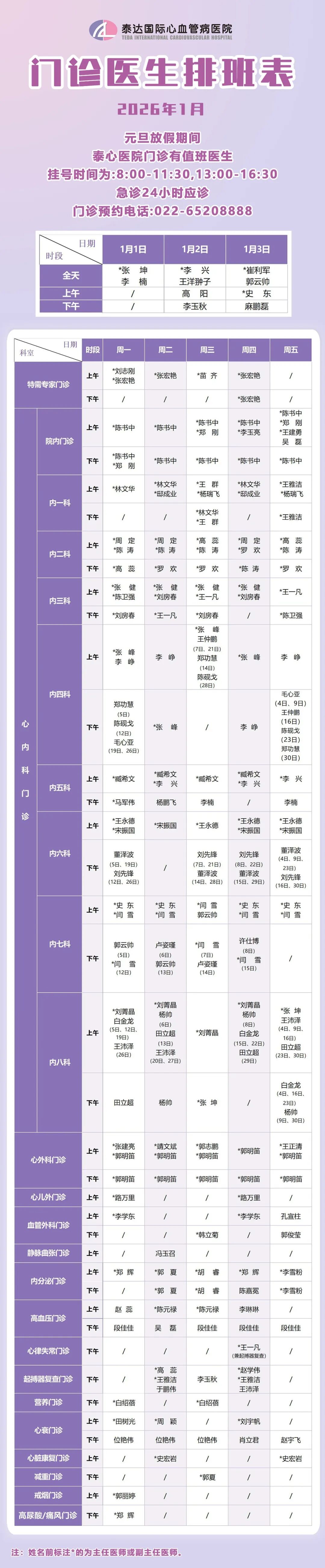 便民医路通丨2026年1月门诊排班表(附元旦期间出诊安排)