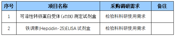 为便于供应商及时了解可溶性转铁蛋白受体(sTfR)测定试剂盒等耗材项目调研信息,现将泰达国际心血管病医院调研信息公开如下: