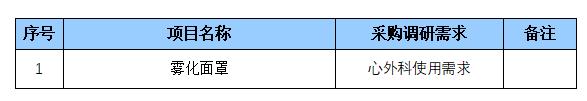 为便于供应商及时了解雾化面罩耗材项目调研信息,现将泰达国际心血管病医院调研信息公开如下: